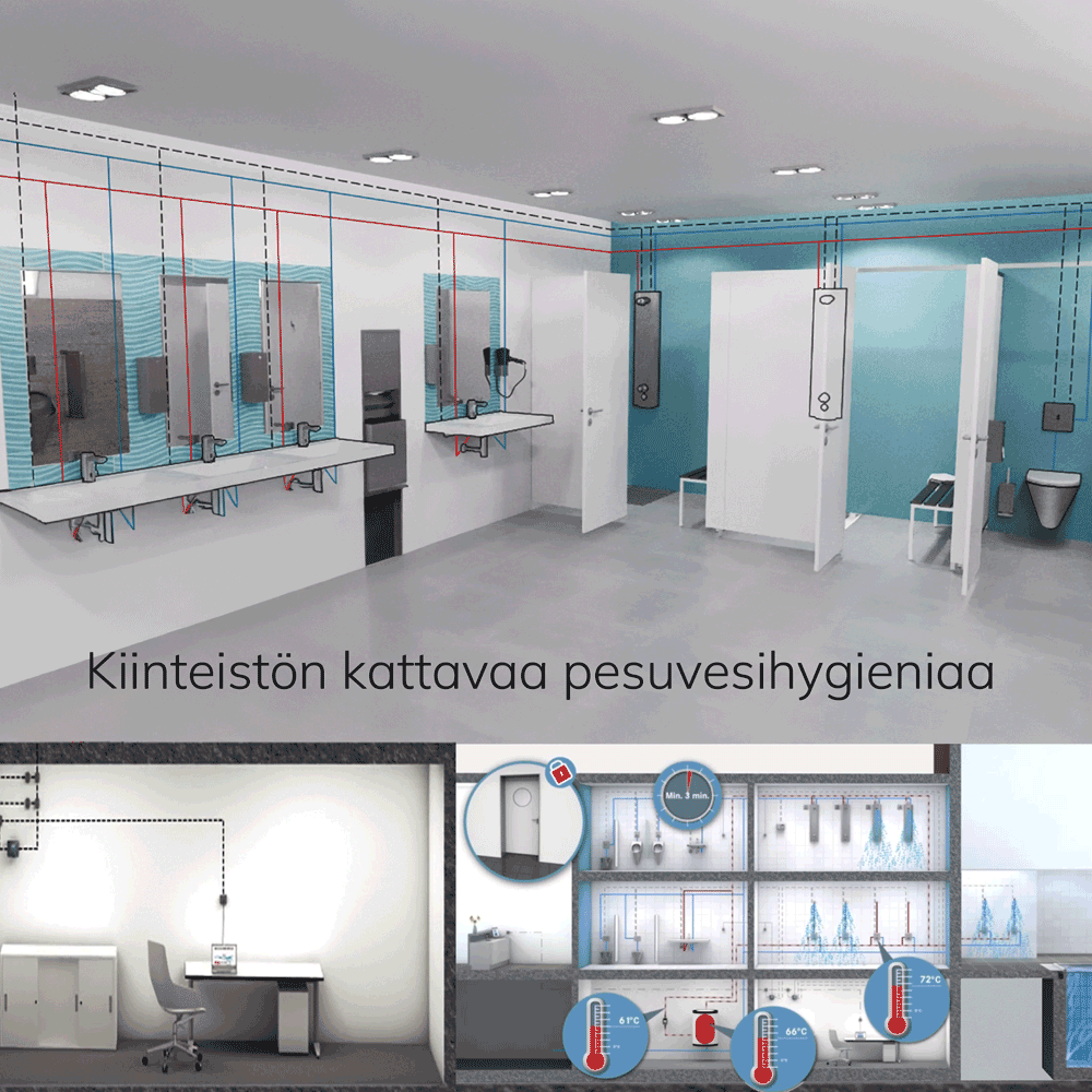 KWC Professional on kehittänyt julkiset vesikalusteet ja hanatuotteet, jotka voidaan ohjelmoida huuhtelemaan itsensä säännöllisesti. Järjestelmä on nimeltään AQUA 3000 open. Järjestelmän avulla ohjelmoitavat säännölliset hygieniahuuhtelut ja lämpödesinfioinnit ehkäisevät legionella-bakteerien muodostumista suihkuista ja muista vesipisteistä. Materiaalit kestävät jopa 72 °C lämpötilaa. Lisäksi huuhtelu poistaa putkistojen sisälle mahdollisesti muodostuneen biofilmin. Huuhtelut voivat tapahtua esim. yöaikaan ja suihkuryhmä kerrallaan. Järjestelmä desinfioi myös suihkupäät. Huuhteluja voidaan seurata ja ajastaa WEB-käyttöliittymän kautta. Järjestelmä on yhdistettävissä kiinteistönhallintajärjestelmään, ja se kerää samalla tietoa käyttömääristä, viimeisimmistä toteutuneista huuhteluista ja lämpötiloista vesikalusteella. AQUA 3000 open -vedenohjausjärjestelmä on asennettu mm. Keuruun ja Pieksämäen uimahalleihin sekä Joensuussa kattavasti kaikkiin liikunta- ja uimahalleihin.