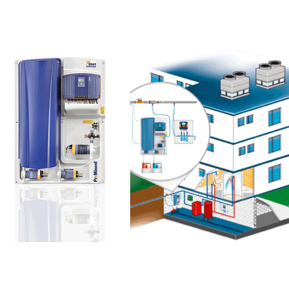 Klooridioksidilaitteisto Bello Zon®. Klooridioksidilla voidaan käsitellä jopa kokonaisia vesijärjestelmiä legionella-bakteeria vastaan, sillä se poistaa biologista kasvustoa putkistoista ja säiliöistä luotettavasti. Säästää kustannuksissa minimaalisen kemikaalien käytön ansiosta.